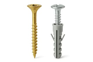 Винт с дюбелем — это уже система из двух элементов. В стену сначала вставляют дюбель, подобранный под тип основания, а уже потом в него вкручивают винт. При затяжке дюбель распирается внутри отверстия, цепляется за стенки за счёт формы и материала, и именно он передаёт нагрузку на стену. Винт при этом фактически служит «распорным» элементом, а не режущим.